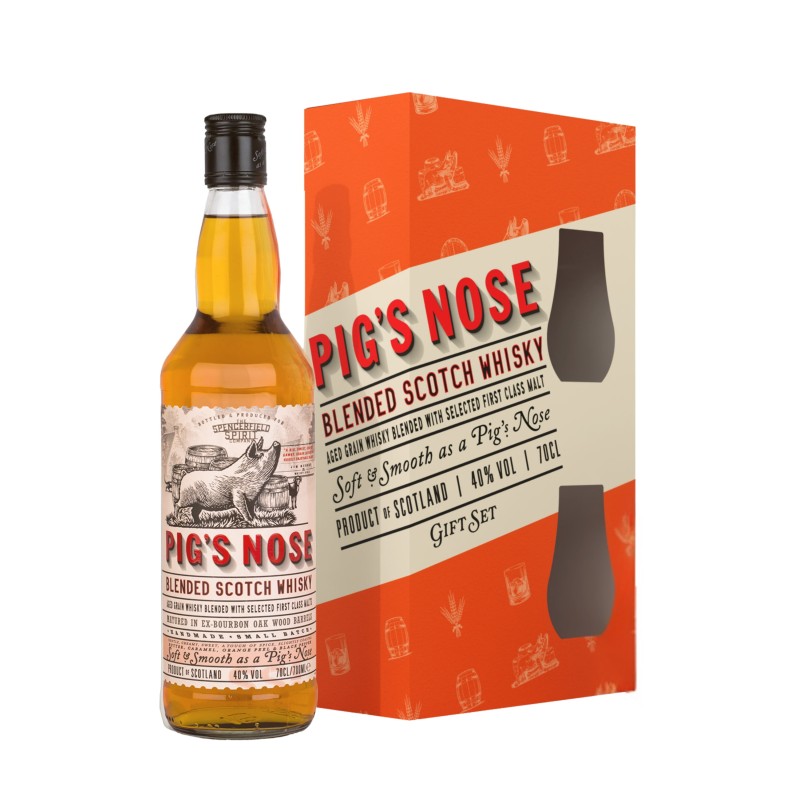 Pig’s Nose, « aussi doux que le nez d’un cochon », porte bien son nom ! Ce blend est élaboré à partir d’un assemblage de malts du Speyside, d’Islay et des Lowlands, mais également avec du whisky de grain supérieur issu de la distillerie Invergordon.